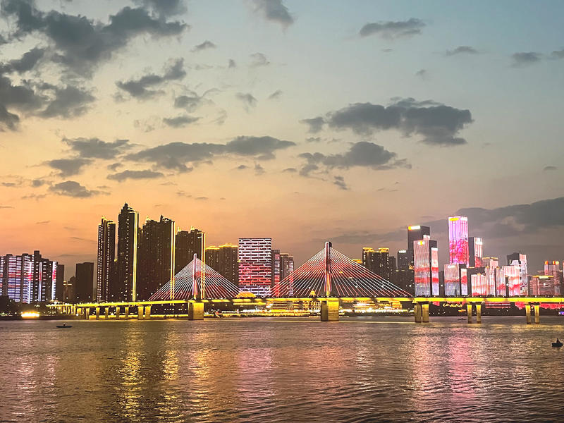 如题,每天傍晚从江畔走过,看到那一丝丝阳光慢慢从江心消逝,耀眼的灯光在两岸闪烁着红尘的辉煌,时光就是这样一天天流逝,但是记忆却和风景一起定格,湘江两岸的灯光总有一直记录的冲动,正所谓: